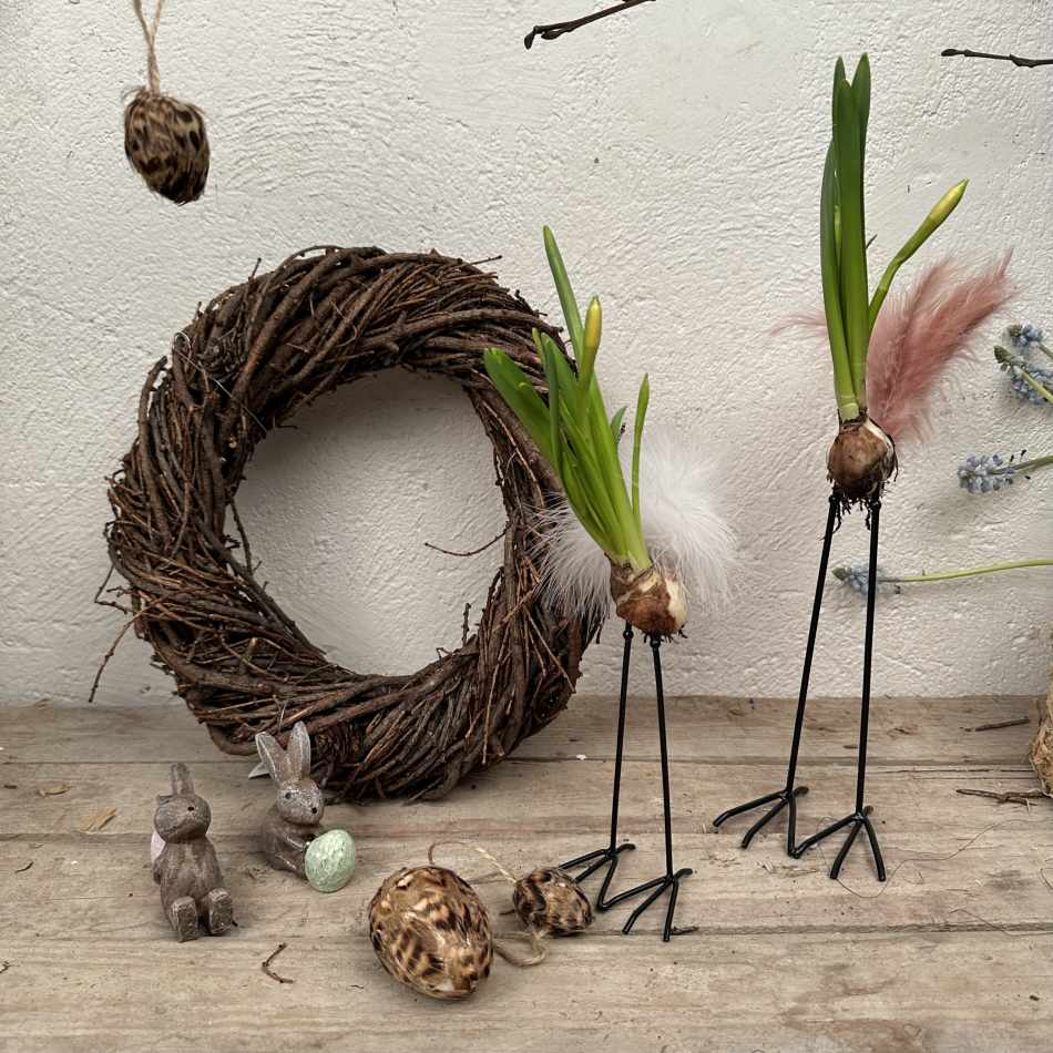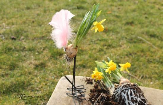 Sätt fötterna på tex en påskliljelök vars blad och blomma börjat växa ut, sätt sedan en fjäder löken och få en alldeles unik påskkyckling som förgyller dagen extra mycket.
