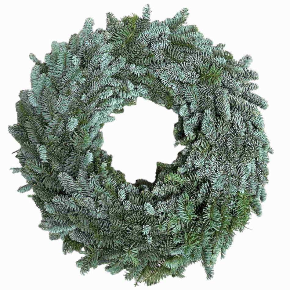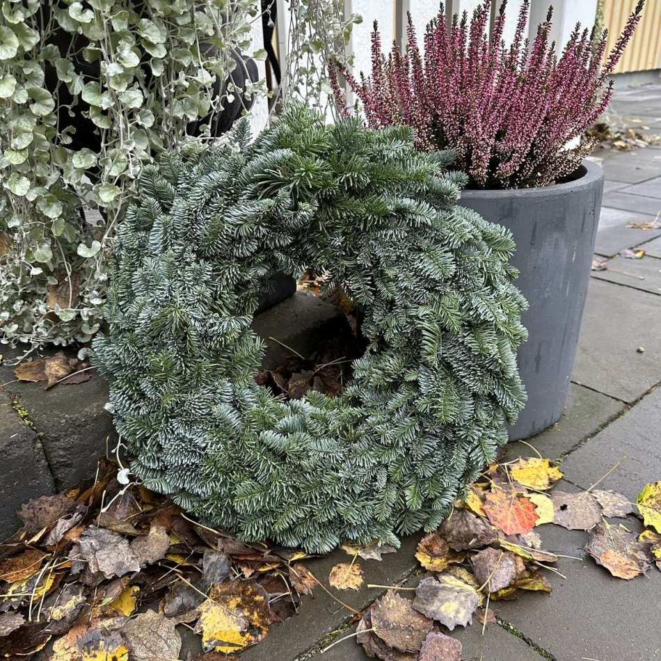 Krans i Nobilisris ävenp på baksidan på kransen, dvs rundbunden. Kransen är ca a 39 cm i diameter.