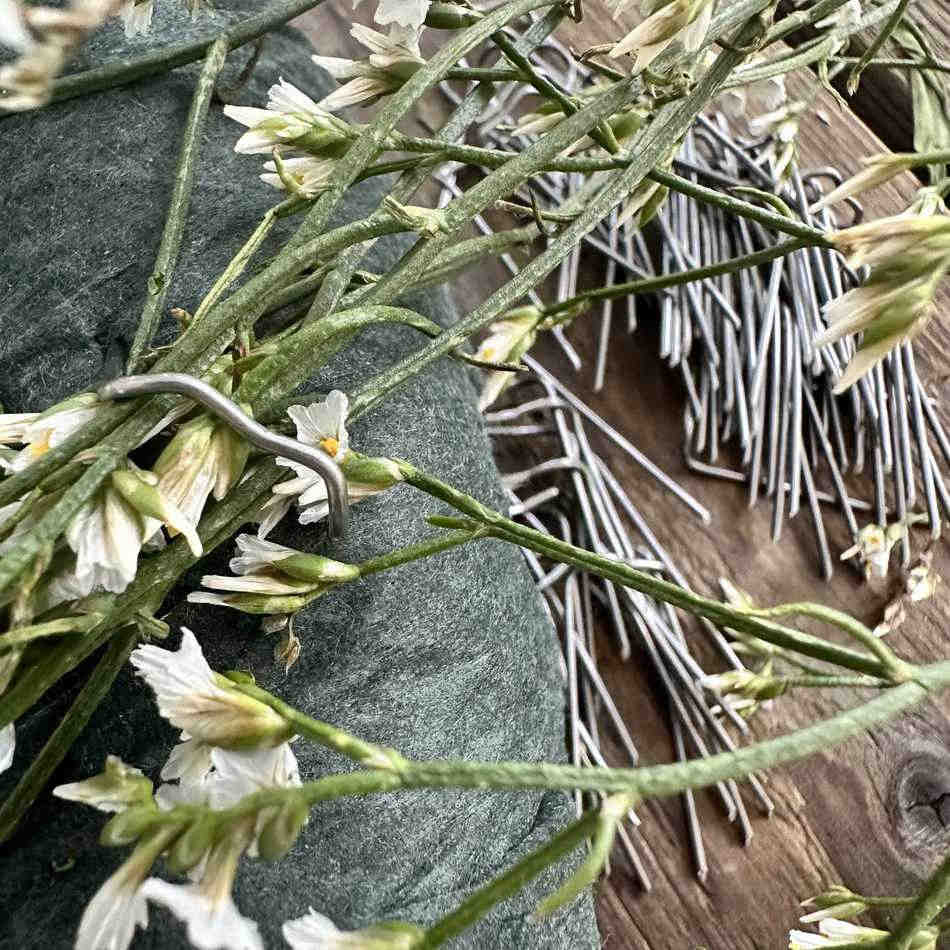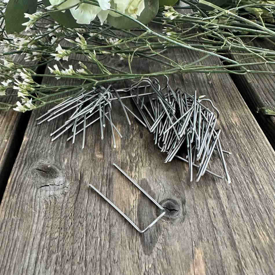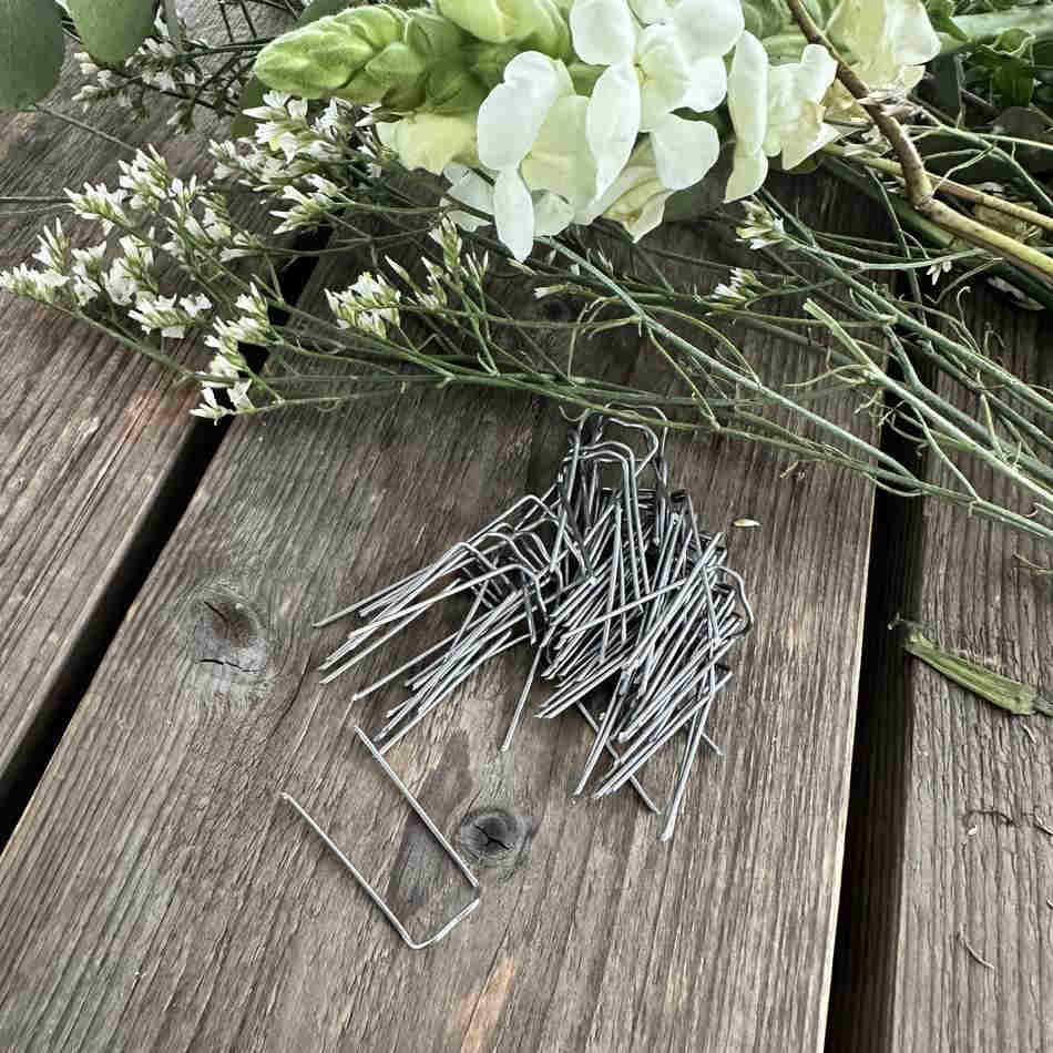 Kransklamrar gjorda av ståltråd. Används till att fästa löv, blommor och dekorationer i kransar mm.
