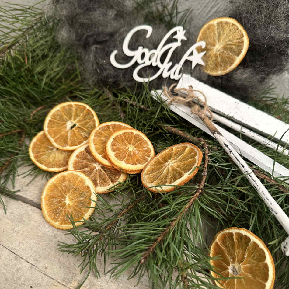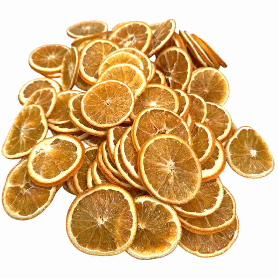 Torkade apelsinskivor i varierande storlek med ljuvlig doft av apelsin.